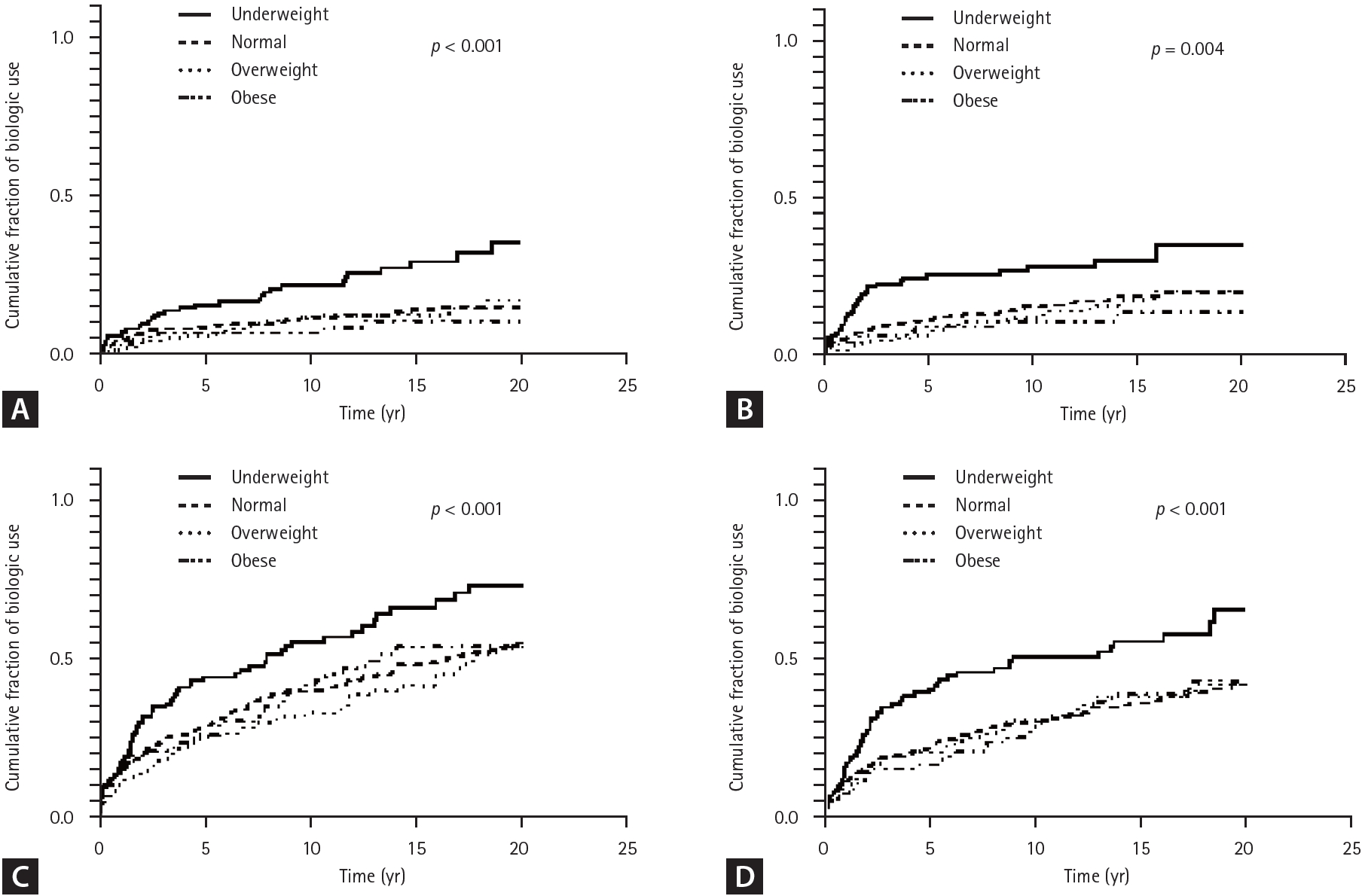 Patients with lower BMI had significantly higher cumulative rates of biologcis use (26.2%, 13.0%, 13.8%, 9.6% % for the underweight, normal, overweight, and obese groups, respectively; p trend = 0.002) (Table 2). The mean times to initiation of first biologics use was 15.0 ± 0.6, 17.7 ± 0.3, 17.9 ± 0.4, and 18.4 ± 0.5 years for the underweight, normal, overweight, and obese groups respectively; with shorter time to biologics initiation observed in the lower BMI group (p < 0.001) (Fig. 1A).