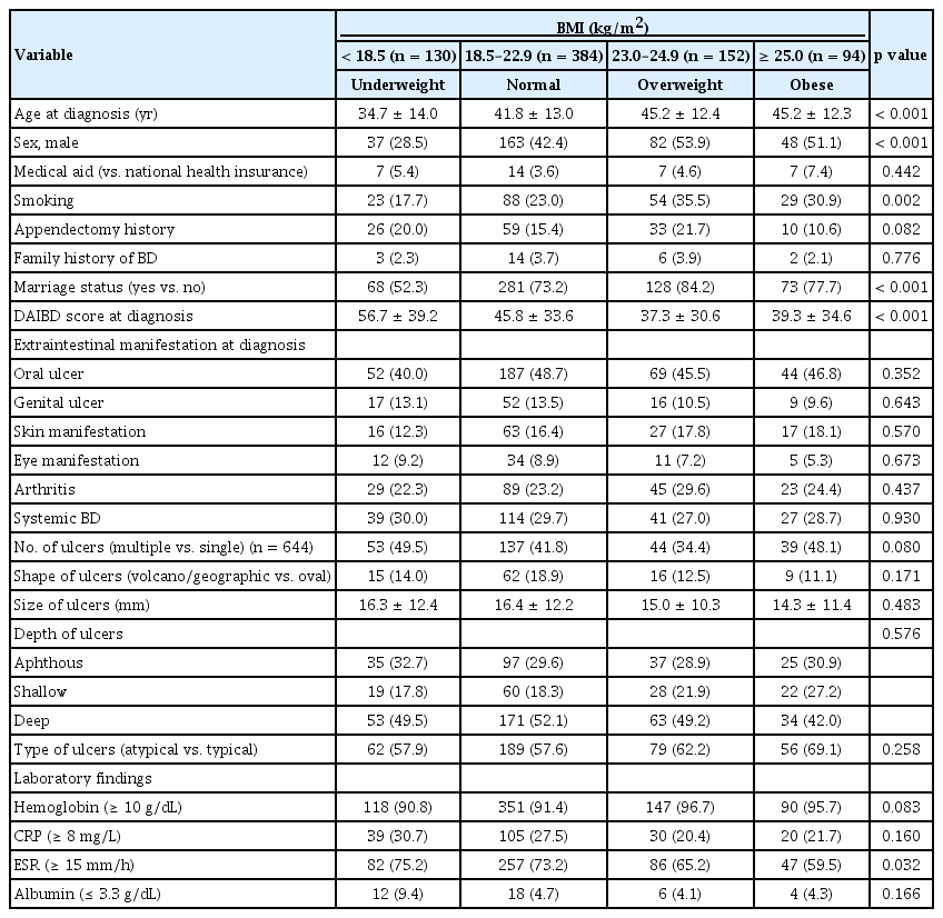 A retrospective analysis of 760 patients with intestinal BD was conducted. Patients were classified by BMI as underweight (< 18.5 kg/m2), normal (18.5–22.9), overweight (23.0–24.9), or obese (≥ 25.0). The association between BMI and clinical outcomes—biologics, surgery, hospitalization, and emergency visits—was examined.