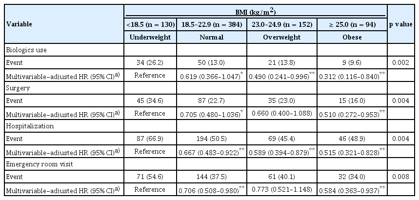 Among 760 patients, 130 (17.1%) were underweight, 384 (50.5%) normal, 152 (20.0%) overweight, and 94 (12.4%) obese. Higher BMI linked to lower cumulative rates of biologics use (p trend = 0.002), surgery (p trend = 0.004), hospitalization (p trend = 0.004), and emergency visits (p trend = 0.008). Compared with the underweight group, the normal (HR 0.667, 95% CI 0.483–0.922, p = 0.014), overweight (HR 0.589, 95% CI 0.394–0.879, p = 0.010), and obese groups (HR 0.515, 95% CI 0.321–0.828, p = 0.006) had lower hospitalization risks. The overweight (HR 0.490, 95% CI 0.241–0.996, p = 0.049) and obese (HR 0.312, 95% CI 0.116–0.840, p = 0.021) groups were negatively associated with future biologics use. The normal (HR 0.705, 95% CI 0.480–1.036, p = 0.075) and obese (HR 0.510, 95% CI 0.272–0.953, p = 0.035) groups were negatively associated with future surgery in multivariable analysis.