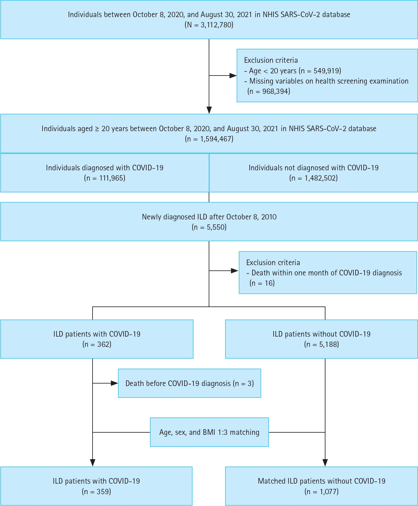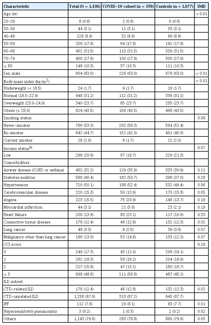 We used the NHIS SARS-CoV-2 database (n = 3,112,780) for our analysis. After excluding 549,919 individuals younger than 20 years and 968,394 individuals with missing demographic characteristics, a total of 1,594,467 individuals aged ≥ 20 years between October 8, 2020, and August 30, 2021, remained in the dataset (111,965 diagnosed with COVID-19 and 1,482,502 not diagnosed with COVID-19). Among them, we identified 5,550 individuals newly diagnosed with ILD after January 1, 2010. Next, we excluded 16 individuals who died within one month (lag period) of COVID-19 diagnosis. Consequently, 362 individuals with ILD were diagnosed with COVID-19 (COVID-19 cohort), and 5,188 individuals with ILD were not (control cohort). Within the COVID-19 cohort, three individuals who died before official diagnosis were further excluded, resulting in a final COVID-19 cohort of 359 individuals. To build a matched control group, we performed 1:3 matching based on age, sex, and BMI, creating a set of controls of 1,077 individuals without COVID-19 (Fig. 1).