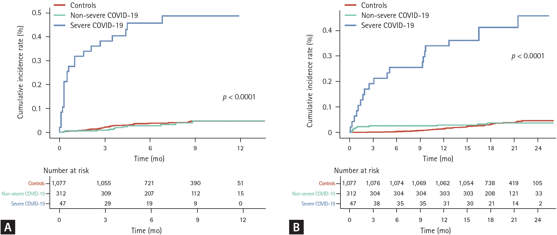 Descriptive statistics are presented as numbers (percentages) for categorical variables. We compared two groups using the χ2 test for categorical variables. The incidence rates of severe exacerbation and death were calculated by dividing the number of incident events by the total follow-up period (per 1,000 person-years). A cumulative incidence plot was used to compare the incidences of severe exacerbation and death, and a log-rank test was utilized to evaluate significant differences between the two groups.