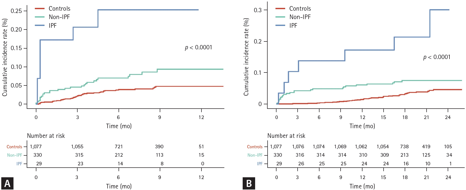 (A) Cumulative incidence of severe exacerbation according to ILD subtype. (B) Cumulative incidence of death according to ILD subtype. Zero on the X-axis indicates 30 days after COVID-19 diagnosis. ILD, interstitial lung disease; COVID-19, coronavirus disease 2019; IPF, idiopathic pulmonary fibrosis.