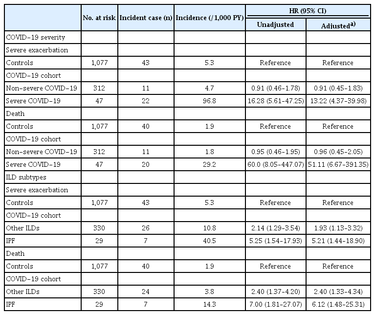 During a mean follow-up of 7.4 months, the COVID-19 cohort had a higher risk of severe exacerbation compared to controls (aHR 2.26, 95% CI 1.38–3.69). During a mean follow-up of 19.6 months, the COVID-19 cohort had a higher risk of death (aHR 2.79, 95% CI 1.63–4.79) compared to controls. When considering COVID-19 severity, the severe COVID-19 group had a higher risk of severe exacerbation and death compared to controls, while the non-severe COVID-19 group did not show increased risk of severe exacerbation or death. In analyses based on ILD subtype, individuals with idiopathic pulmonary fibrosis in the COVID-19 cohort had the highest risk of severe exacerbation and death.