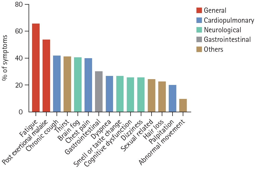Because a few participants did not respond to all survey questions regarding certain symptoms, only the responses for each symptom were included in the analysis. The most frequent symptom was fatigue (65.7%), followed by PEM (53.7%), chronic cough (41.9%), thirst (41.5%), brain fog (40.3%), and chest pain (40.0%) (Fig. 1). Among 58 participants with a complete set of symptom records, 5 (8.6%) did not exhibit any symptoms. Participants who had one or more symptoms had a median of four symptoms (interquartile range 2–7). When individuals were divided into groups based on the number of symptoms and observed over time, approximately 20% of individuals still possessed more than eight symptoms even after six months post-diagnosis (Supplementary Table 2).