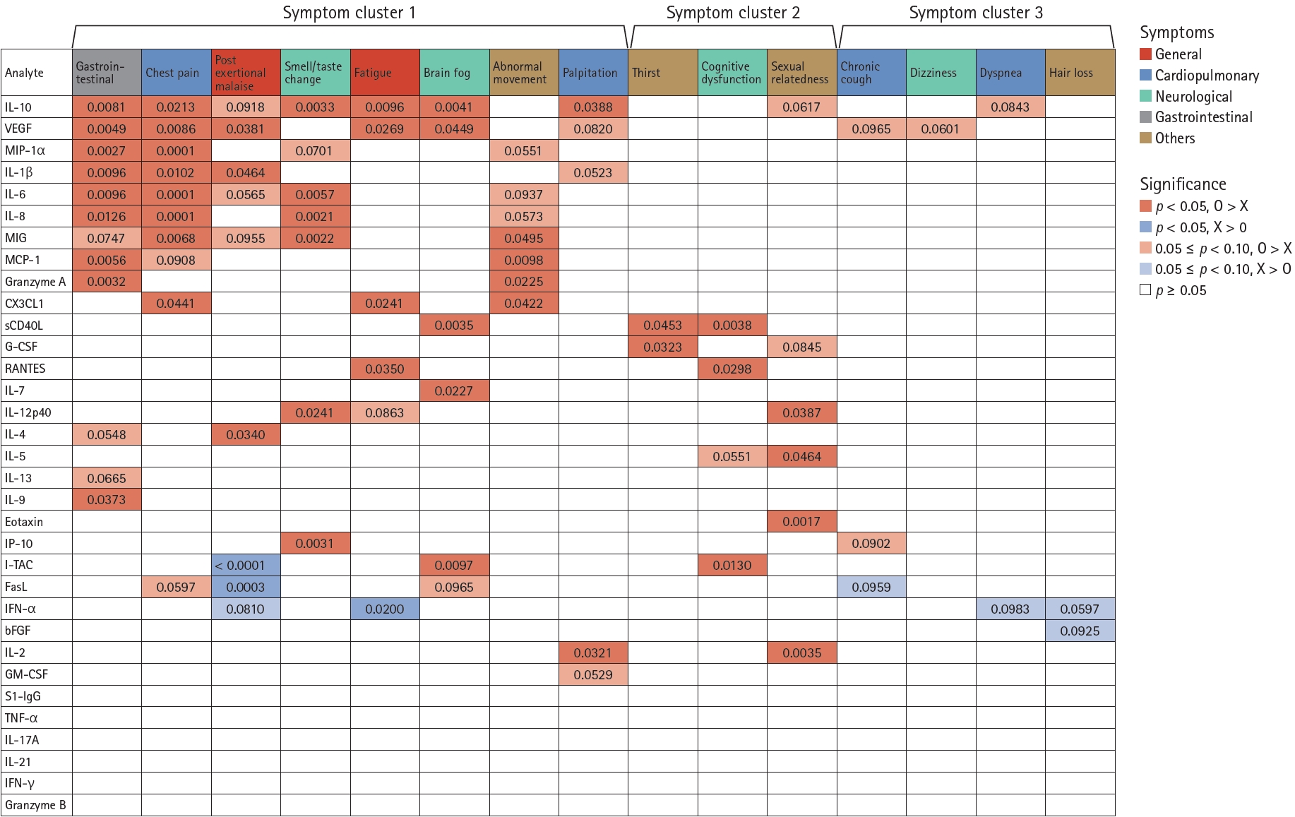 Although several hypotheses, including dysregulated immune response, persistent viral reservoir, dysregulated microbiota, and endothelial abnormalities, have been proposed, the pathophysiology underlying PASC remains unclear due to the varied definitions of PASC among previous studies [4-8]. In this study, our objective was to examine the patterns of cytokine expression related to particular PASC symptoms to elucidate the underlying mechanism of PASC.