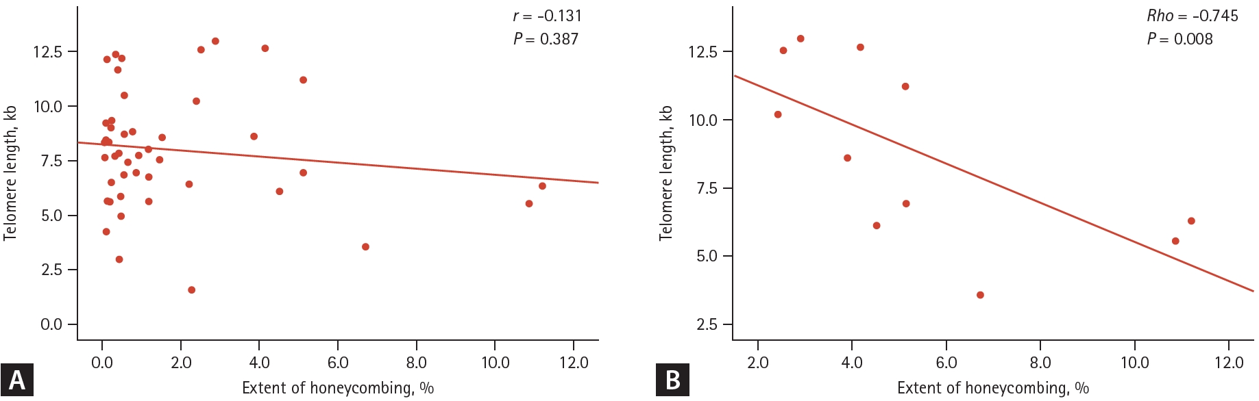 We used Spearman correlation analysis to evaluate the relationship between TL and honeycombing extent in patients with RA-ILD. All tests were two-sided, and p values less than 0.05 were considered statistically significant. We performed all statistical analyses using R (version 4.1.0) and SPSS Statistics for Windows, version 17 (SPSS Inc., Chicago, IL, USA).