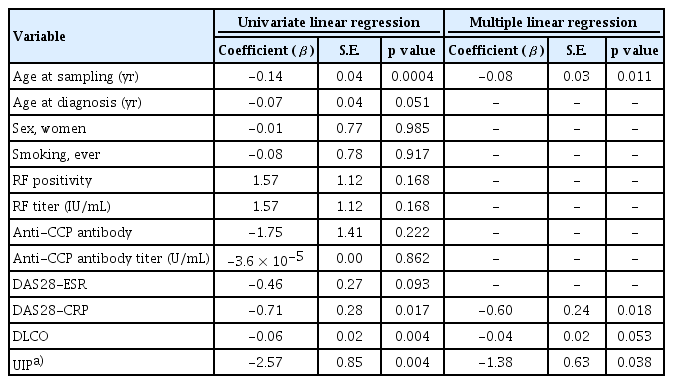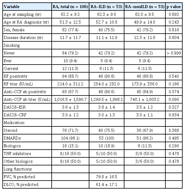 At the time of enrollment, demographic data (age at sampling, age at RA diagnosis, sex, and disease duration) and smoking status (never, ever, or current) were collected. Rheumatoid factor (RF) and its titer, anti-cyclic citrullinated peptide (CCP) antibody and its titer, disease activity score 28 (DAS28)–erythrocyte sedimentation rate (ESR), DAS28–C-reactive protein (CRP), RA medication, and lung function data were obtained within 6 months of the chest CT scan.