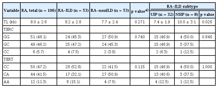 Next, we assessed whether the presence of ILD in RA patients was associated with TL. After 1:1 age- and sex-matching among the 216 selected patients with RA (70 with RA-ILD and 146 with RA-nonILD), we compared TL between 53 patients with RA-ILD and 53 patients with RA-nonILD. Baseline demographics and clinical characteristics, including autoantibody positivity, disease activity, and medication, did not differ significantly between the two groups (Table 1). The mean absolute TL for RA patients (n = 106) was 8.0 ± 2.6 kb, with no significant difference observed between RA-ILD and RA-nonILD patients (8.2 ± 2.8 kb and 7.7 ± 2.4 kb, respectively, p = 0.271; Table 2). There were also no differences in TERC and TERT polymorphisms between the two groups.