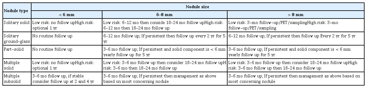 The Fleischner Society offers detailed follow-up strategies based on the nodule size and individual risk factors. For instance, small nodules (< 6 mm) may require minimal follow-up in low-risk patients, whereas larger or irregular nodules may require close monitoring or further diagnostic evaluation (Table 1) [9].