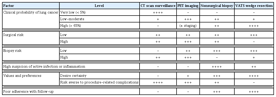 Clinicians can use validated clinical prediction models that integrate multiple risk factors to estimate the likelihood of malignancy. The Brock model incorporates variables such as sex, age, nodule size, family history of cancer, emphysema, number of nodules, solid components, upper lobe involvement, and bed parameters [10]. The risk probability is classified as low if it is < 5%, moderate if it is between 5% and 65%, and high if it is > 65%. The Mayo model considers age, nodule size, smoking history, history of cancer without 5-year restrictions, upper lobe involvement, nodule spiculation, and positron emission tomography (PET) scan information [17]. Although there are several old models, no single superior predictive model exists. Therefore, clinical judgment, in conjunction with imaging features, is crucial for estimating the malignancy risk.