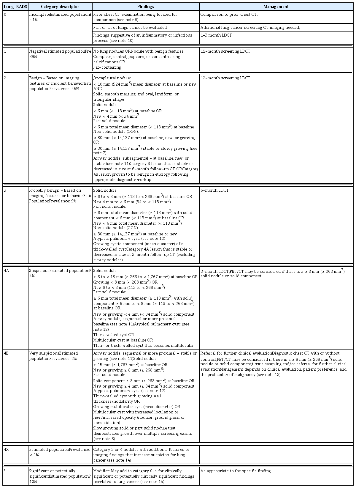The Lung-RADS standardizes the reporting of LDCT findings and is widely used [23]. Radiologists assign a Lung-RADS score (LR 0–4) that considers lung nodules and other findings associated with lung cancer (e.g., airway nodules and atypical cystic lesions), potentially inflammatory/infectious lesions, and other important incidental findings. Each LR score correlates with the lung cancer risk. The primary factors considered in the LR score are nodule consistency, size, and growth, along with other nodule factors, including peripheral and juxtapleural nodule locations and bed margins. Based on this risk, recommendations are made for further management. The LR scores are periodically revised; the most recent version is the Lung-RADS 2022 (Table 3). The Lung-RADS defines LR-1 and LR-2 as “negative” and LR-3 and LR-4 as “positive” CT screening results.