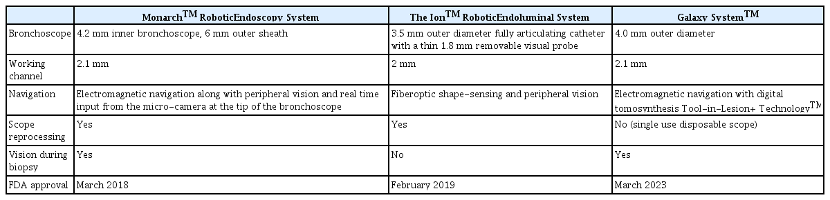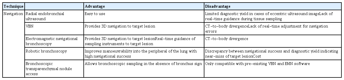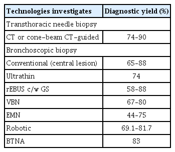 Recent advancements in bronchoscopic techniques, including CT reconstruction-based navigation, electromagnetic navigation bronchoscopy (ENB), endobronchial ultrasound (EBUS), and robotic bronchoscopy, have improved diagnostic yields compared with fluoroscopy-guided bronchoscopy alone (Table 4, 5). However, these specialized techniques are only available in select centers and require specific training for their proper use.