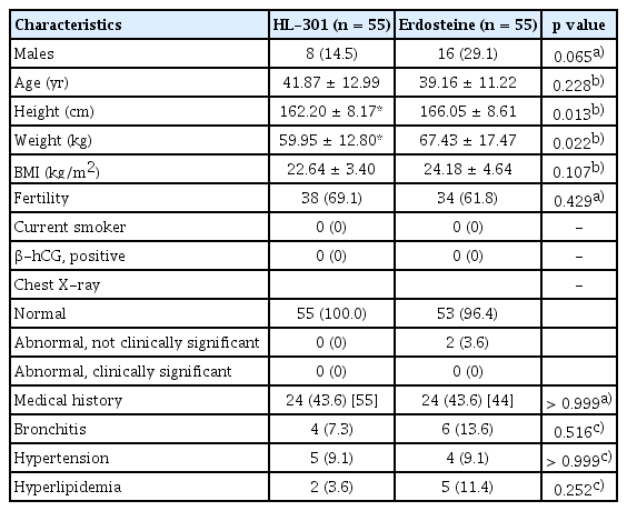 In the HL-301 group, 14.5% of the participants were male, and the mean age was 41.87 ± 12.99 years (Table 1). In the erdosteine group, 29.1% of the participants were male, and the mean age was 39.16 ± 11.22 years. The differences in age and sex distribution between the two groups were not significant. Significant differences in height and weight were observed between the groups, but there was no significant difference in body mass index.