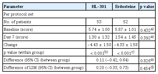 In the PPS, the mean total BSS in the HL-301 group decreased significantly from 5.74 ± 1.00 at baseline to 1.30 ± 1.32 on day 7, with a mean change of −4.43 ± 1.50 (p < 0.001) (Table 2). In the erdosteine group, the mean total BSS decreased from 5.87 ± 1.01 at baseline to 1.54 ± 1.45 on day 7, with a mean change of −4.33 ± 1.58 (p < 0.001). The mean difference in BSS change between the erdosteine group and the HL-301 group was 0.11, which was not significant (p = 0.826) (Fig. 2). The lower limit of the one-sided 97.5% CI was −0.42, which exceeded the clinical non-inferiority margin of −0.99, indicating that HL-301 was not inferior to erdosteine in terms of total BSS change.