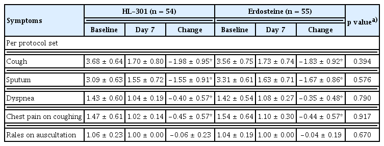 2. Both HL-301 and erdosteine significantly reduced symptoms (cough, sputum production, dyspnea, chest pain during coughing, and wheezing), and there were no significant differences between the groups.