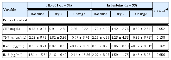 In the PPS analysis, the mean changes in inflammatory markers from baseline to day 7 showed no significant decrease in CRP, TNF-α, or IL-1β level in the HL-301 group, whereas those levels did decrease significantly in the erdosteine group; however, the overall changes did not differ significantly between the groups (Table 4). Additionally, when the analysis was adjusted for baseline CRP level, the difference in CRP between the groups on day 7 was not significant (p = 0.799). IL-6 level showed no significant decrease in either group, with no significant difference in overall change between the groups. Likewise in the FAS, the mean changes in inflammatory markers did not differ significantly between the groups (Supplementary Table 3).