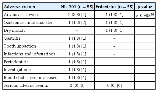 Adverse events occurred in 3.6% of the participants in the HL-301 group and 1.8% in the erdosteine group, and all events were of mild severity (Table 5). The most frequently reported adverse event was gastrointestinal disorder, occurring in 1.8% of the HL-301 group and 1.8% of the erdosteine group. No serious adverse events were reported in either group.