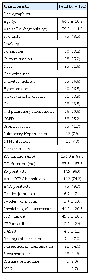 A total of 151 patients diagnosed with RA-ILD were included in this study. Their baseline characteristics are presented in Table 1. The mean age of the patients was 64.3 ± 10.2 years. The cohort was comprised of 73 males (48.3%) and of patients with variable smoking history, including 38 (25.2%) current smokers, 20 (13.2%) ex-smokers, and 93 (61.6%) non-smokers. Comorbidities included diabetes mellitus in 25 patients (16.6%), hypertension in 40 (26.5%), cardiovascular disease in 21 (13.9%), and cancer in 28 (18.5%). Regarding pulmonary conditions, 16 patients (10.6%) had old pulmonary tuberculosis, 38 (25.2%) had chronic obstructive pulmonary disease (COPD), 63 (41.7%) had bronchiectasis, 12 (7.9%) had pulmonary hypertension, and 11 (7.3%) had non-tuberculous mycobacterial infections. The mean durations of RA and ILD were 134.0 ± 89.0 months and 87.5 ± 67.7 months, respectively. RF-positive- and anti-CCP Ab-positive patients numbered 145 (96.0%) and 112 (74.2%), respectively, with a baseline DAS28 mean score of 4.9, indicating moderate disease activity. Radiographic erosions were observed in 71 patients (47.0%). Extra-articular manifestations included sicca symptoms in 18 patients (11.9%), rheumatoid nodules in 3 (2.0%), and membranous glomerulonephritis in 1 patient (0.7%).