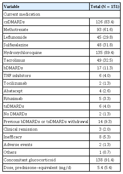 The medications used to treat RA in this study cohort are listed in Table 2. Out of the 151 patients, 126 (83.4%) were receiving conventional synthetic disease-modifying anti- rheumatic drugs (csDMARDs). Among them, hydroxychloroquine was the most commonly used, taken by 135 patients (89.4%). The other csDMARDs included methotrexate (93 patients, 61.6%), tacrolimus (49 patients, 32.5%), sulfasalazine (48 patients, 31.8%), and leflunomide (45 patients, 29.8%). Biological DMARDs (bDMARDs) were used in 17 patients (11.3%), with tumor necrosis factor inhibitors being the most common (6 patients, 4.0%), followed by rituximab (5 patients, 3.3%), abatacept (4 patients, 2.6%), and tocilizumab (2 patients, 1.3%). Targeted synthetic DMARDs (tsDMARDs) were used by 6 patients (4.0%). Additionally, a significant proportion of patients (138 patients, 91.4%) were on concomitant glucocorticoid therapy, with a mean prednisone-equivalent dose of 5.4 mg/d.