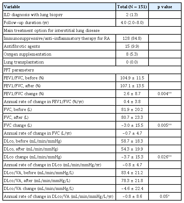 This retrospective study included individuals aged ≥ 18 years diagnosed with RA-ILD at Ajou University Hospital from January 1999 to March 2022. Diagnosis was based on chest computed tomography (CT) scans; progression was monitored based on available follow-up pulmonary function tests (PFTs) and chest CTs. Logistic regression analysis identified factors associated with ILD progression and mortality.