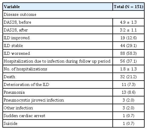 Table 4 shows various outcomes observed during the follow-up period of RA-ILD patients. The mean DAS28 score improved from 4.9 to 3.2. In terms of ILD progression, 88 patients (58.3%) experienced ILD progression, 44 patients (29.1%) were classified as ILD stable, and 19 patients (12.6%) as ILD improved. Among the patients, 56 (37.1%) were hospitalized because of infections, while 32 (21.2%) died; the majority of deaths were attributed to ILD exacerbation or pulmonary-related infections.