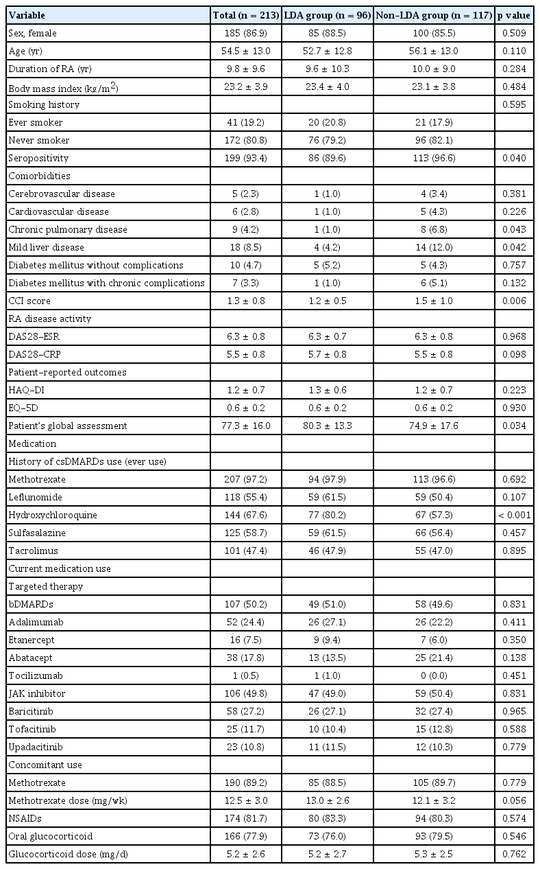 Of the 456 patients with RA undergoing targeted therapy, 213 (46.7%) who continued their initial treatment despite not achieving LDA at 24 weeks were included in this study (Fig. 1). All 213 patients continued treatment until week 48 without any discontinuations. Based on the RA activity at week 48, the patients were categorized into two groups: 96 and 117 in the LDA and non-LDA groups, respectively. Thus, 45.1% of patients (96 of 213) who did not achieve LDA by week 24 but continued the targeted therapy until week 48 ultimately attained LDA.