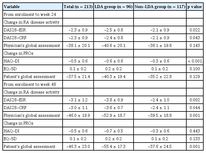 At week 24, the improvements in RA activity from enrolment, as measured using DAS28-ESR (-2.5 ± 0.8 vs. -2.1 ± 0.9, p = 0.022) and DAS28-CRP (-2.4 ± 0.8 vs. -2.1 ± 0.9, p = 0.043), were significantly greater in the LDA group than in the non-LDA group (Table 2, Fig. 2). Additionally, the reduction in HAQ-DI was more pronounced in the LDA group from enrolment to week 24 than in the non-LDA group (-0.6 ± 0.6 vs. -0.3 ± 0.6, p < 0.001).