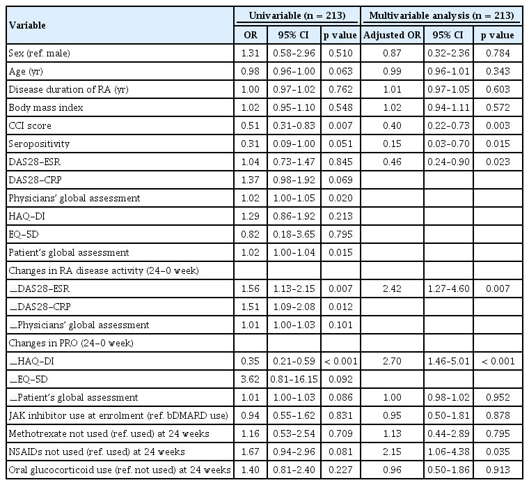No significant differences were observed in demographic characteristics, medication use, and RA activity at enrolment between the LDA and non-LDA groups. However, patients in the non-LDA group had more comorbidities, and physician and patient global assessments using VAS were higher in the LDA group. The LDA group also showed greater improvements in DAS28-ESR and DAS28-CRP at week 24. Factors associated with achieving LDA by week 48 included fewer comorbidities, seronegativity for RA, greater reductions in DAS28-ESR and HAQ-DI from enrolment to week 24, and not using NSAIDs at week 24.