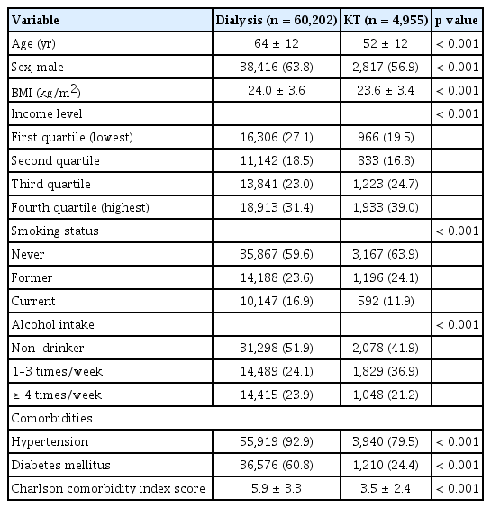 This study enrolled 65,157 participants (60,202 in the dialysis group and 4,955 in the KT) (Fig. 1). All KT patients were receiving immunosuppressants. Table 1 summarizes their baseline characteristics. Compared with the KT group, the dialysis group was older, consisted mostly of males, had a lower income level, and was more likely to be a current smoker and a heavy drinker (p < 0.001). While the dialysis group had a higher body mass index (BMI), the KT group had lower hypertension and DM prevalence and mean CCI score (p < 0.001).