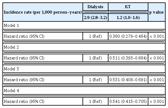 The disease status was determined using the 10th International Classification of Diseases and Related Health Problems (ICD-10). We defined dialysis as the combination of ICD-10 codes for ESRD (N185, N189, or Z49) and a dialysis prescription for ≥ 3 months. An ICD-10 code of Z94.0 indicated KT. Hypertension was defined as the combination of the ICD-10 codes I10–13 and I15, antihypertensive prescription, and either ≥ 1 ICD-10 code for hypertension for any reason on admissions or ≥ 2 ICD-10 codes for hypertension on outpatient visits. Furthermore, we defined diabetes mellitus (DM) as the combination of the ICD-10 codes E11–14, antidiabetic prescription, and either ≥ 1 ICD-10 code for DM for any reason on admissions or ≥ 2 ICD-10 codes for DM on outpatient visits. Demographic data collected during the baseline national health screening were extracted from the NHIS database. In addition, information on personal income level, smoking habit, and alcohol consumption was collected using a self-administered questionnaire survey. The Charlson Comorbidity Index (CCI), a well-known method for classifying prognostic comorbidity in longitudinal studies, was evaluated according to health insurance claims during the 2-year retrospective period from the baseline [11,12].