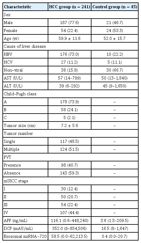 1. Circulating exosomal miR-720 expression was significantly upregulated in HCC vs. non-HCC subjects.