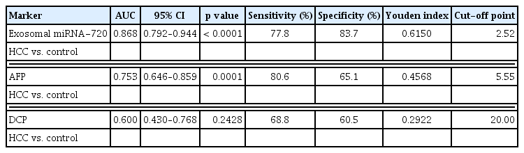 3. Circulating exosomal miR-720 could be used as a novel diagnostic marker, with comparative advantages over conventional markers in diagnosing small HCC and in patients with elevated AST/ALT levels.