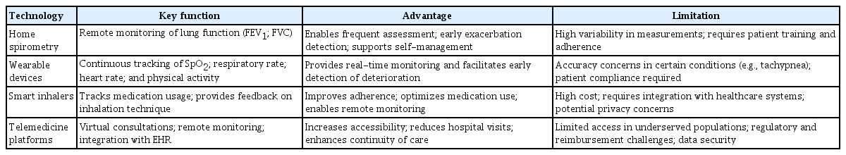 The technological foundations of telemedicine in the management of chronic lung diseases include home spirometry, wearable devices, smart inhalers, and telemedicine platforms (Table 1). Home spirometry enables remote lung function assessment for early disease detection, whereas wearable devices provide continuous physiological monitoring. Smart inhalers track the real-time use of medication to enhance patient adherence. Telemedicine platforms integrate these tools for remote monitoring, data-driven interventions, and improved patient-provider communication (Fig. 1).