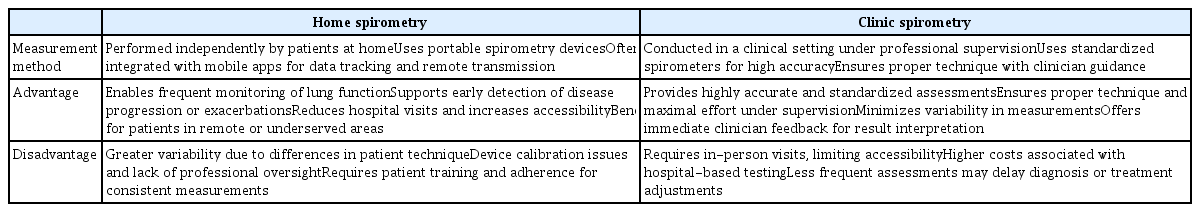 Spirometry is the gold standard for diagnosing and monitoring respiratory diseases [13]; however, its access has been significantly limited, particularly during the COVID-19 pandemic, thereby reducing its clinical utilization and emphasizing the need for home-based alternatives. Home spirometry allows patients to measure major lung function parameters (forced expiratory volume in one second [FEV1] and forced vital capacity [FVC]) without supervision, offering an alternative to clinic-based testing [13] (Table 2). Home spirometry is increasingly being used as a major clinical outcome measure in clinical trials for chronic lung diseases, including COPD [14], fibrosing ILD [15], idiopathic pulmonary fibrosis (IPF) [16,17], asthma [18,19], and bronchiectasis [20]. Its role in monitoring disease severity and guiding treatment decisions has expanded, making it an essential tool in both research and clinical practice. Although the COVID-19 pandemic accelerated the adoption of home spirometry in routine care and clinical trials, evidence comparing its reliability with supervised testing remains limited.
