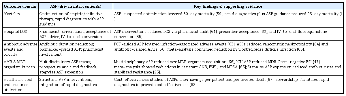 ASPs have been associated with a reduction in AMR and the emergence of MDR organisms in populations, including patients with sepsis. In an Italian pre–post quasi-experimental study of Gram-negative bloodstream infections, involvement of a multidisciplinary stewardship team reduced new MDR organism acquisition from 36.6% to 8.3% (OR, 0.17; 95% CI, 0.05–0.67), with shorter antibiotic treatment durations, high rates of appropriate empirical therapy, and decreased microbiological failure but without differences in 30-day mortality [66]. The implementation of a prospective audit-and-feedback ASP in two ICUs led to a significant reduction in overall antibiotic consumption and the incidence of bloodstream infections caused by MDR Gram-negative organisms without affecting mortality or LOS [47]. A systematic review and meta-analysis showed that ASP implementation was associated with reduced incidence of resistant Gram-negative bacteria, extended-spectrum β-lactamase–producing Enterobacterales, and methicillin-resistant Staphylococcus aureus infection [65]. In Korea, the stepwise expansion of ASPs in tertiary care hospitals has significantly reduced the overall antibiotic use and contributed to the stabilization or decline in resistance rates for major nosocomial pathogens, despite increments in national resistance trends [25]. These data suggest that ASPs can help limit the resistance and spread of MDR organisms, although well-designed studies focusing specifically on sepsis are limited.