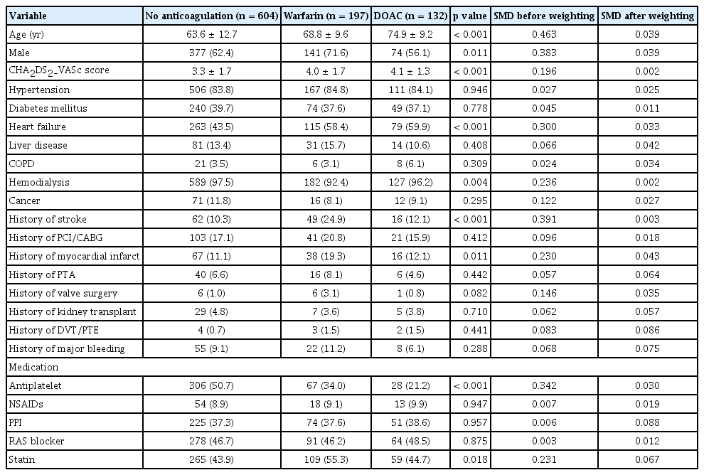 Cox proportional hazards regression was used for clinical outcome analyses. The proportional hazards assumption was evaluated by inspecting log(-log[survival]) plots and testing Schoenfeld residuals; no violations were detected. To reduce confounding, we used propensity scores to adjust imbalances across treatment groups. The propensity score for assignment to no anticoagulation, warfarin, or DOAC was estimated with a multinomial logistic regression that included age and CHA2DS2-VASc score (continuous) and the following categorical covariates: sex, heart failure, history of stroke, history of myocardial infarction, history of peripheral artery intervention, history of valve surgery, liver disease, cancer, type of dialysis, history of MB, antiplatelet medication, proton pump inhibitor medication, and statin medication. Variables with a standardized mean difference (SMD) > 0.1 among groups were included. Given the sample size (n = 933), the number of covariates was limited. Based on the propensity score, inverse probability of treatment weighting (IPTW) was applied to balance covariates across the three groups (no anticoagulation, warfarin, and DOAC) [21]. The C-statistic (concordance statistic) for the propensity model was 0.69. Covariate balance between groups was assessed using SMDs, with SMD ≤ 0.1 considered adequate. Balance before and after weighting is shown in Table 1.