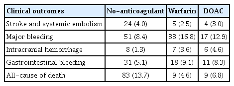 Event number and incidence rate at 2 years for no-anticoagulant, warfarin and direct oral anticoagulants group