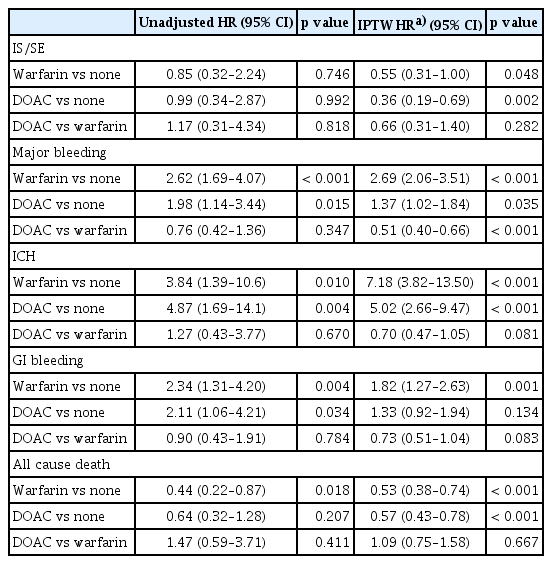 Relative to no anticoagulation, both warfarin (IPTW-adjusted hazard ratio [aHR], 0.55; 95% confidence interval [CI], 0.31–1.00; p = 0.048) and DOACs (IPTW aHR, 0.36; 95% CI, 0.19–0.69; p = 0.002) were associated with a lower risk of IS/SE.