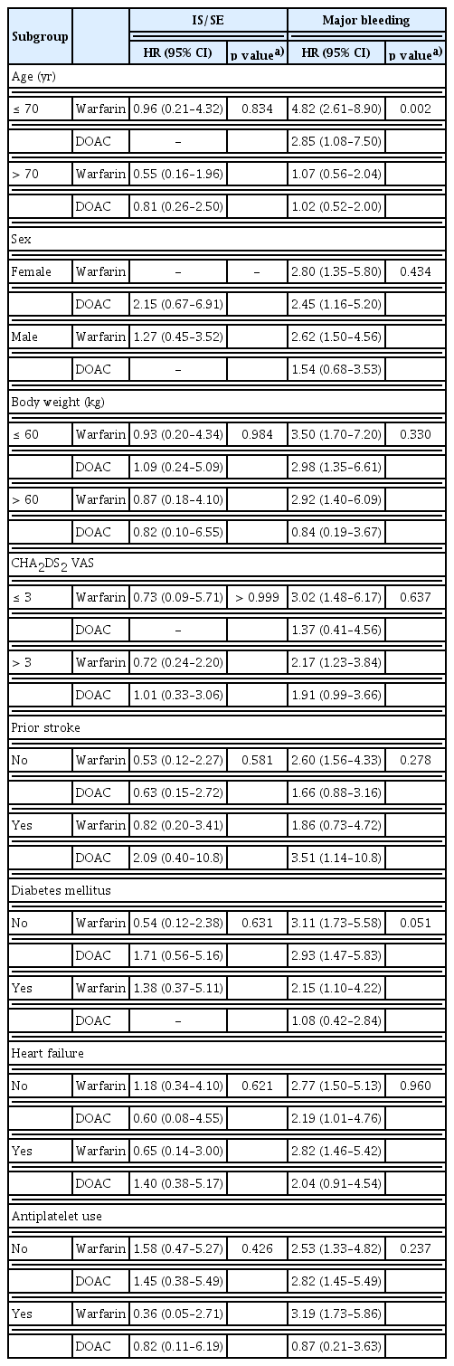 Crude event counts for clinical outcomes by treatment across subgroups are presented in Supplementary Table 1. HRs for the primary outcomes are shown in Table 4. Age significantly interacted with treatment for MB. Among patients aged > 70 years, both warfarin (aHR, 1.07 [0.56–2.04]; p for interaction = 0.002) and DOACs (aHR, 1.02 [0.52–2.00]; p for interaction = 0.002) showed a trend toward lower MB risk relative to the corresponding treatments in patients aged < 70 years.