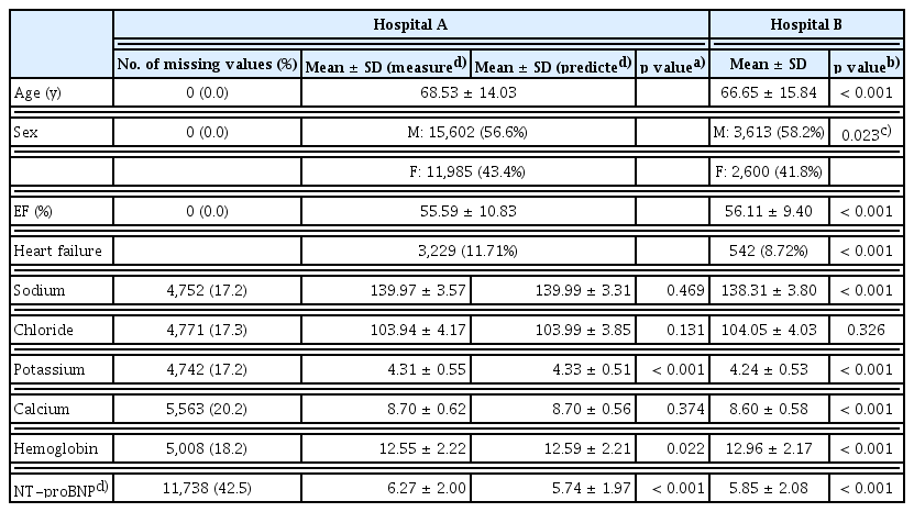 At Hospital A, the mean age of patients was 68.53 ± 14.03 years, with 56.6% being male, and the mean LVEF was 55.59%. The proportion of missing metadata ranged from 17.2% to 42.5%, with the highest number of missing data points observed for NT-proBNP levels. After imputing the missing metadata using a deep neural network, significant differences were noted in potassium, hemoglobin, and NT-proBNP levels, whereas sodium, chloride, and calcium levels did not show statistically significant differences. At Hospital B, the mean patient age was 66.65 ± 15.84 years, with 58.2% being male, and the mean LVEF was 56.11%. When comparing the post-imputation dataset from Hospital A to Hospital B, significant differences were observed in all parameters except for chloride levels (Table 1).