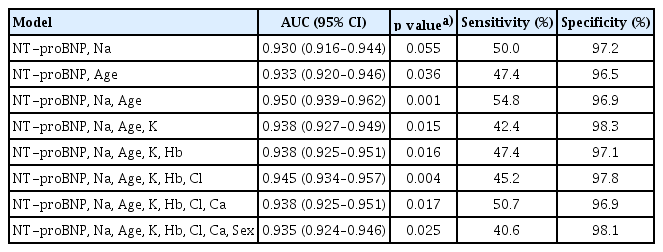 At a fixed sensitivity of 90%, the combined model yielded a predicted LVEF cut-off of < 54.4 with a specificity of 0.879, whereas the ECG-only model yielded a cut-off of < 60.5 with a specificity of 0.716. Among individual clinical variables, NT-proBNP, serum sodium, and chloride showed statistically significant predictive performance (AUCs 0.858, 0.597, and 0.557, respectively), while calcium, sex, hemoglobin, potassium, and age did not yield statistically meaningful discrimination (AUCs ranging from 0.504 to 0.592).