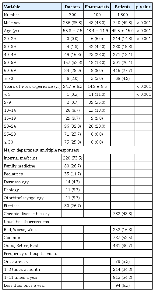 The web survey link was sent via email or text message exclusively to participants who voluntarily opted in. For patients, panel information registered with the research company was used, and for doctors and pharmacists, the registered panel information or the contact details collected with consent during the application process were used. If there was no response, the link was resent up to five times to encourage participation. Data collection was completed over one month (June 19 2024–July 17, 2024), with responses from 300 doctors, 100 pharmacists, and 1,500 patients. A total of 1,900 participants were included in this study.