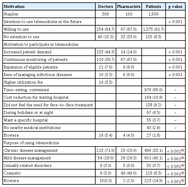 Consequently, both doctors and pharmacists expressed willingness to participate in telemedicine in the future, though doctors (84.7%, 254/300) and patients (91.7%, 1,375/1,500) demonstrated statistically significantly higher willingness compared to pharmacists (67.0%, 67/100) (84.7% vs. 67.0%, p < 0.001) (Table 2). The primary motivation for doctors to participate in telemedicine was “increased patient demand” (44.3%, 133/300) and “continuous management of patients with chronic diseases” (36.7%, 110/300). In contrast, pharmacists were primarily motivated by “continuous management of patients with chronic diseases” (67.0%, 67/100), highlighting a significant difference in motivations between doctors and pharmacists (p < 0.001). Additionally, both doctors (7.0%, 21/300) and pharmacists (9.0%, 9/100) indicated a relatively high motivation to participate in telemedicine due to the potential for expanding their patient base. Patients, on the other hand, were primarily motivated by time savings and convenience, cited by 65.0% (976/1,500). Among patients using telemedicine at doctors’ offices, the most common purpose was managing chronic conditions such as hypertension, diabetes, and dyslipidemia (73.2%, 210/287). A smaller but notable proportion sought telemedicine for mild conditions like colds, fevers, allergies, or headaches (18.5%, 53/287). In contrast, at pharmacies, the primary purpose was the purchase of cosmetic-related products, such as treatments for hair loss, skincare, or obesity (49.0%, 49/100), reflecting a significant difference in the purpose of telemedicine visits between hospitals and pharmacies (p < 0.001). This difference in usage trends showed statistically meaningful variations among doctors and patients (p < 0.001) and pharmacists and patients (p < 0.001).