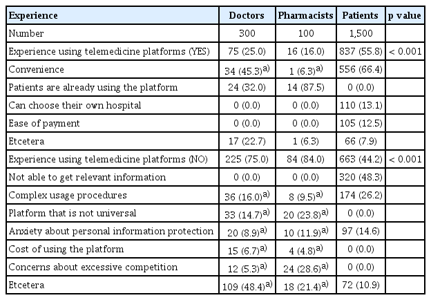 An experience survey was conducted using a structured questionnaire to understand the usage patterns of doctors and pharmacists participating in the telemedicine pilot project. The survey targeted individuals who had used telemedicine at least once between June 1, 2023, when the telemedicine pilot project began, and July 2024, when the survey concluded. The survey was administered online.