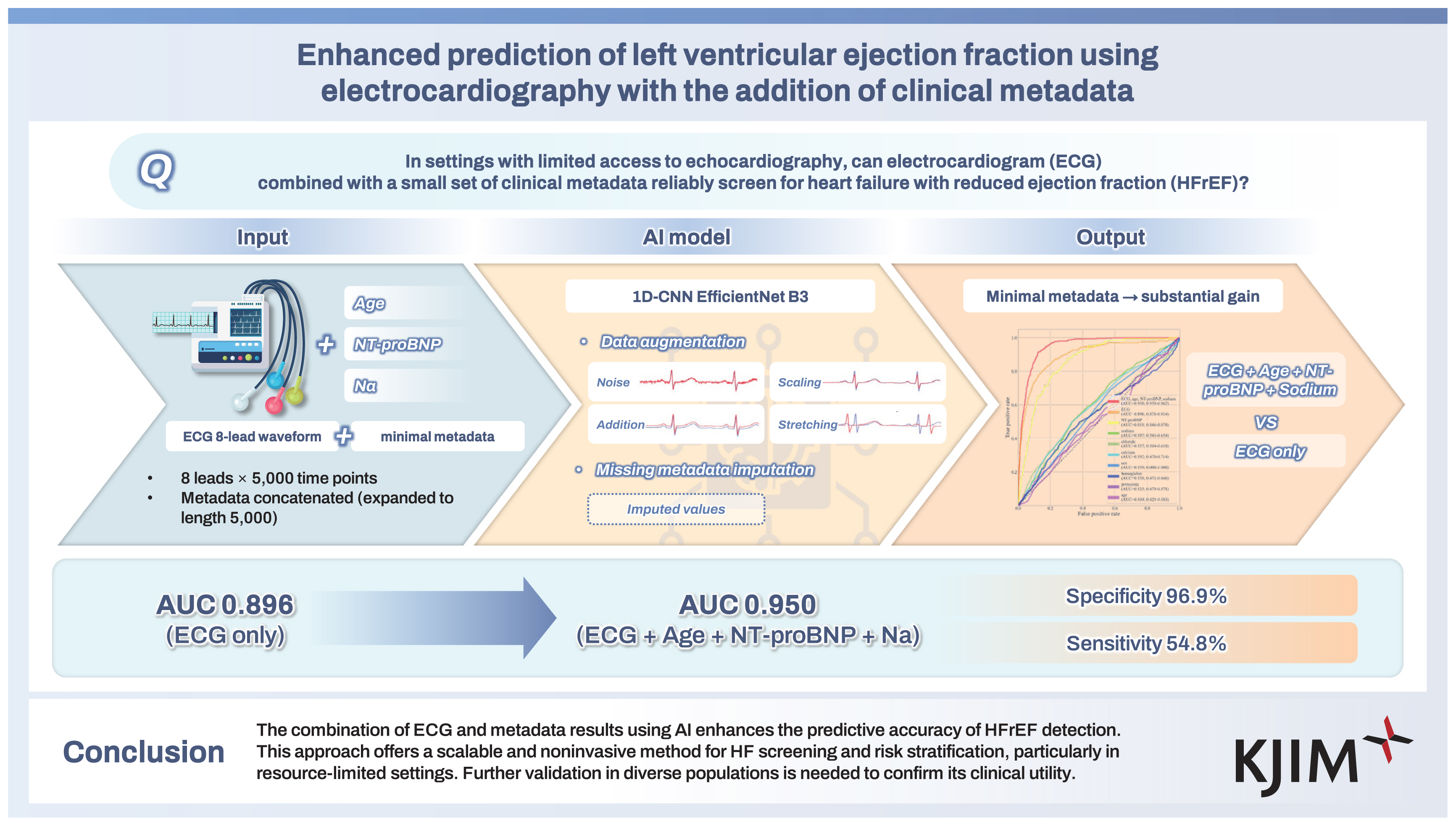 Enhanced prediction of left ventricular ejection fraction using electrocardiography with the addition of clinical metadata