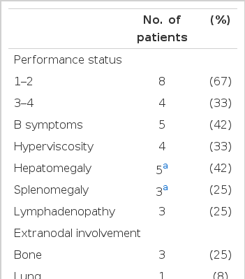 The median age was 57 years (range, 40 to 85), and the male to female ratio was 2. B symptoms and hyperviscosity requiring plasmapheresis existed in 5 and 4 patients, respectively, at the time of diagnosis. Hepatomegaly and splenomegaly were detected in 5 and 3 patients, respectively. Sites of extranodal involvement were bone (3) and lung (1) in 3 patients. The peripheral neuropathy was complicated in 3 patients. (Ed note: check this sentence.) Cryoglobulin was checked in 6 patients and it was detected in 3 of them. The median concentration of serum IgM was 4.2 g/dL (0.7–6.2). The median albumin, hemoglobin, WBC, and platelet levels were 2.8 g/dL, 8 g/dL, 5,400/μL, and 138,000/μL, respectively. One patient had transitional cell carcinoma concomitantly, and one patient developed small cell lung cancer. Of the 11 patients receiving chemotherapy (7-chlorambucil, 2-melphalan, 1-cyclophosphamide, 1-CHOP), 4 patients showed the objective responses including 2 complete remissions, but they all ultimately relapsed. The response rate of second-line therapy was 14% (1/7). After a median follow-up of 20 months, 3 patients were still alive with disease. The median overall and progression-free survival were 24 months (95% confidence interval (CI): 5–43) and 24 months (95% CI: 8–40), respectively.
