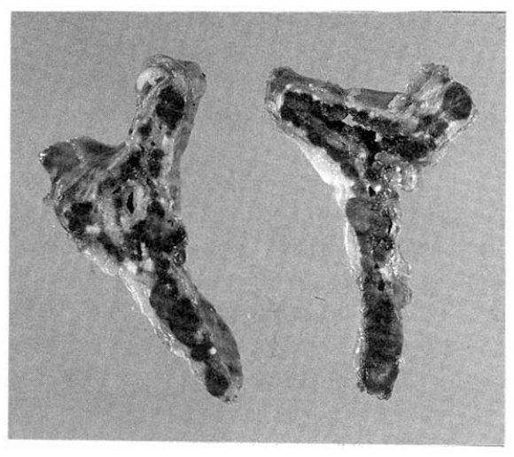 Instead, follow-up study was recommended. Follow-up abdominal CT scan, 3 years after the first study, revealed 2cm-sized hypodense mass in the upper pole of lt, adrenal gland (Fig. 1). So, explorative laparotomy was done under the impression of lt, adrenal adenoma. At operation field, no abnormal adrenal mass was found but the surgeon performed lt, adrenalectomy. The cut surface of surgical specimen showed multiple black pigmented nodules with pale atrophic cortex (Fig. 2).