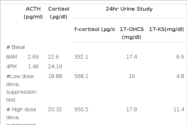 By her history and physical examination, we suspect she had Cushing’s syndrome and then measured 24hr urine free cortisol and performed low dose dexamethasone suppression test. After this study, high dose dexamethasone suppression test was done to differentiate the etiology of Cushing’s syndrome. The levels of plasma cortisol were not suppressed and plasma ACTH level was very low. Abdominal CT scanning was done under the impression of adrenocortical tumor but revealed no abnormal mass in the adreanal gland first. Therefore we performed pituitary fossa MRI to rule out Cushing’s disease associated with micronodular adrenal hyperplasia. MRI reveals atrophic pituitary gland with empty sella. At that time, we didn’t decide the treatment modality for this patient because of poor general condition.