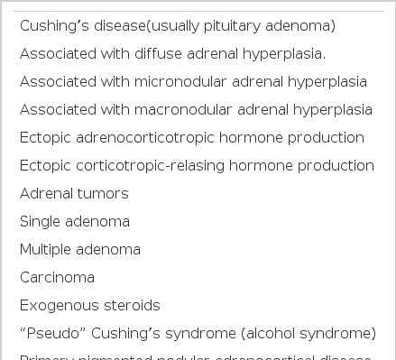 The primary cause of the Cushing’s syndrome may be in the adrenal gland (hyperplasia or neoplasm or infrequently primary pigmented nodular adrenocortical disease like the above patient), outside of adrenal (pituitary adenoma or ectopic secretion of ACTH), iatrogenic (administration of adrenocorticosteroid) (Table 2).
