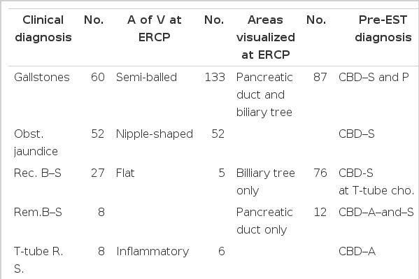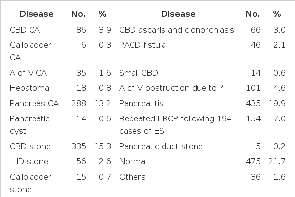 Of 2,185 cases of ERCP(Table 1), biliary tract diseases were found in 813(37.2%) cases, pancreatic diseases in 742(34.0%) cases, obstruction of the ampulla of Vater in 101(4.6%) cases, and normal findings in 475(21.7%) cases. Of 194 patients on whom EST was performed, common bile duct stones were found in 171 patients, ascaris in the common bile ducts of 12 patients, ascaris and stones in the common bile duct of 1 patient, clonorchis in the bile ducts of 4 patients, fibrotic stenosis of the periampullary choledochoduodenal fistula in 1 patient, stenosis of the common bile duct in 1 patient, and stones in the pancreatic ducts of 4 patients.